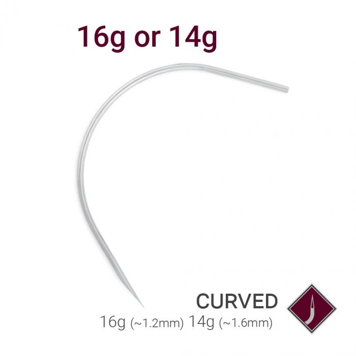 Профессиональные, изогнутые, стерильные иглы для пирсинга из 316L ASTM F-138 стали в индивидуальной упаковке. Заточка игл произведена лазером с трех сторон, что является огромным преимуществом перед катетерными иглами.