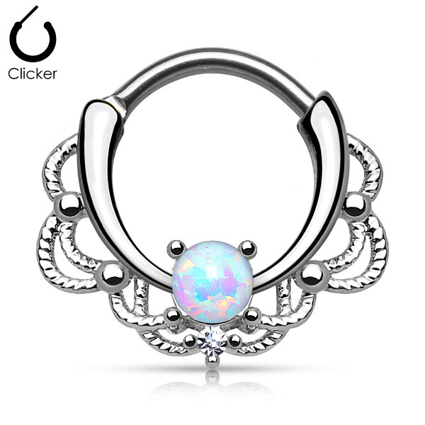 Ажурный кликер из хирургической стали 316L. Декоративная часть из родированной латуни украшена искусственным белым опалом диаметром 4мм.