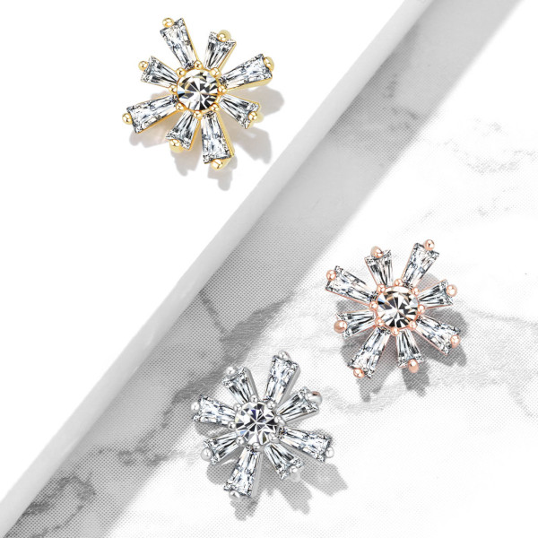 Накрутка из хирургической стали 316L с латунным цветком диаметром 10 мм, лепестки украшены кристаллами. Подходит для украшений толщиной 1,6мм с внутренней резьбой и микродермалов.