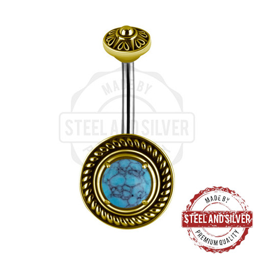 Банан со штангой из хирургической стали 316L. Декоративная часть из латуни украшена в центре искусственной бирюзой.