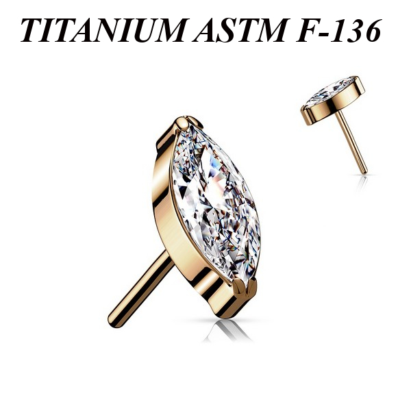 Вставка для безрезьбовых украшений из имплантационного титана 6Al-4V-Eli ASTM: F-136 с PVD покрытием розового золота. Украшена фианитом огранки "маркиз".
