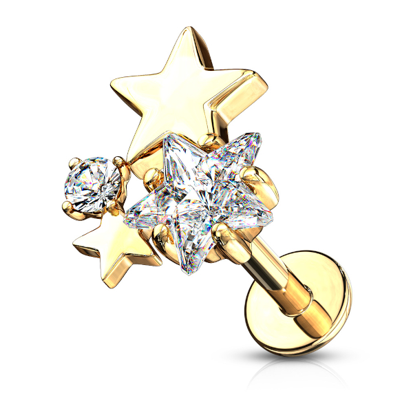 Лабрет из хирургической стали 316L с внутренней резьбой. Представлен в трёх вариантах: классический стальной и с покрытием жёлтого и розового золота. Накрутка из родированной латуни с золотым IP покрытием, украшена фианитами. Размер накрутки: 6х7мм.