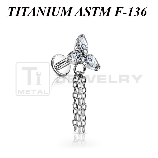 Лабрет из имплантационного титана 6Al-4V-Eli ASTM: F-136 с внутренней резьбой. Украшен кластером с прозрачными фианитами и декоративными цепочками. Размер декоративной части с учётом цепочек: 18х6,5мм.