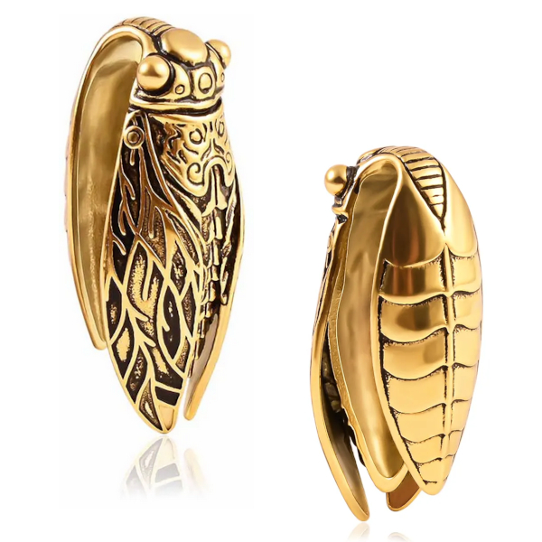 Фигурные подвесы из хирургической стали 316L в форме цикады. Представлены в двух вариантах: классические стальные и с золотым PVD покрытием.