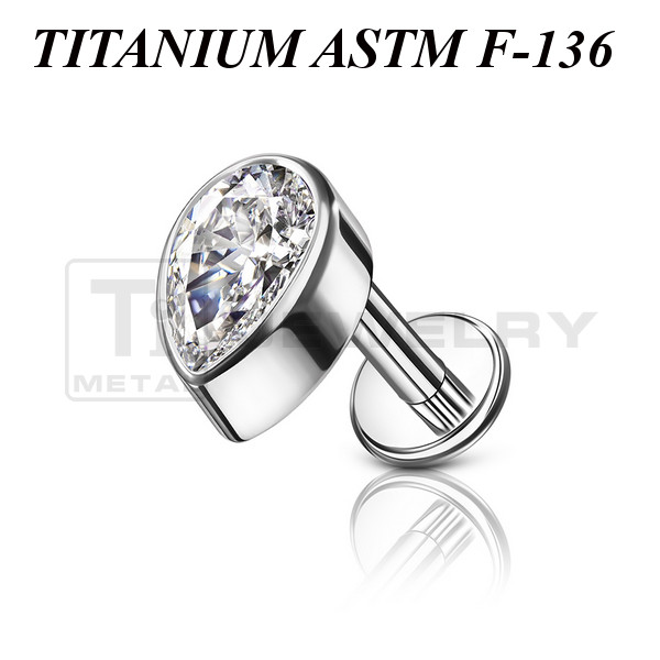 Лабрет из имплантационного титана 6Al-4V-Eli ASTM: F-136 с внутренней резьбой. Украшен накруткой в форме капли с фианитом. Размер накрутки: 4,4х6мм.